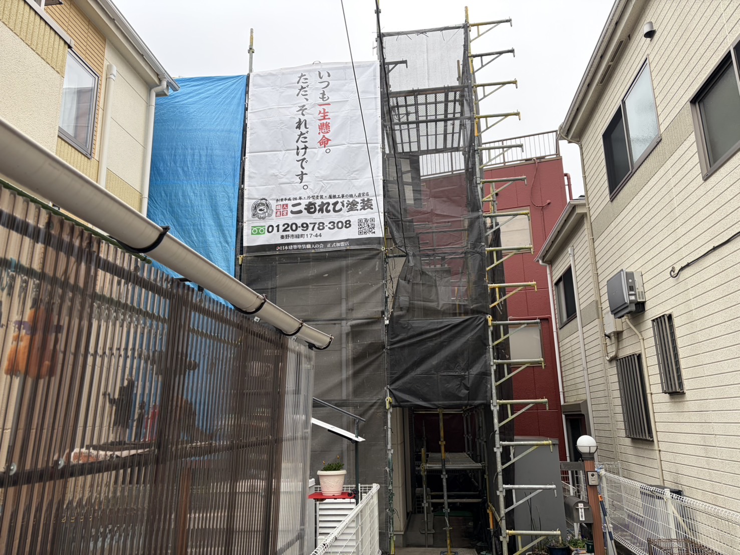 まずは安全第一で足場を設置し飛散防止ネットをしっかり張りました。(↓)