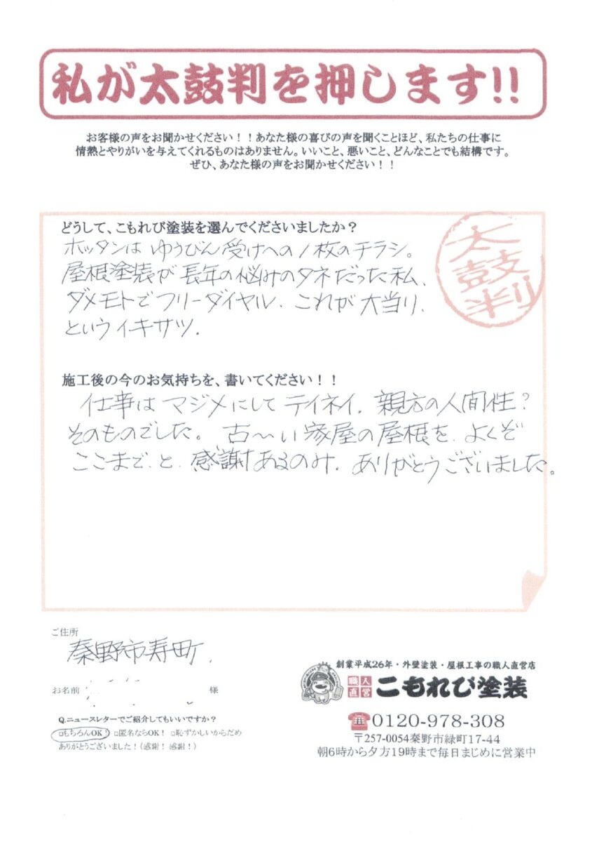 築100年。代々ご家族で屋根を塗り続けてきたという、とても思いの詰まった建物です。しかし、現在、お施主様がご高齢になり、「屋根に上がるのは危険…でも劣化が不安で…」そんな時、郵便受けにこもれび塗装のチラシ。屋根塗装が長年の悩みのタネだったわたし、ダメもとでフリーダイヤルに連絡。これが大当たり!