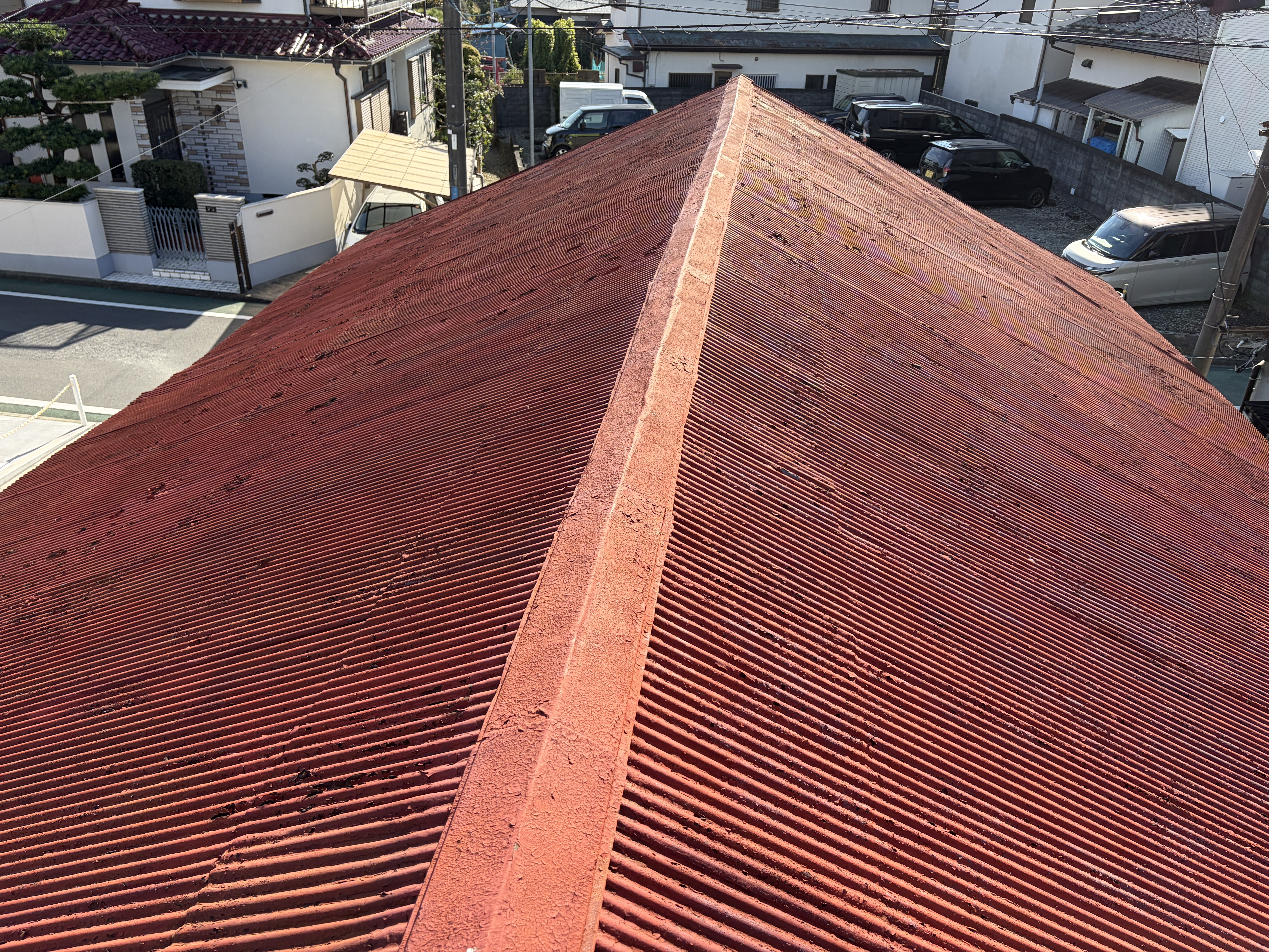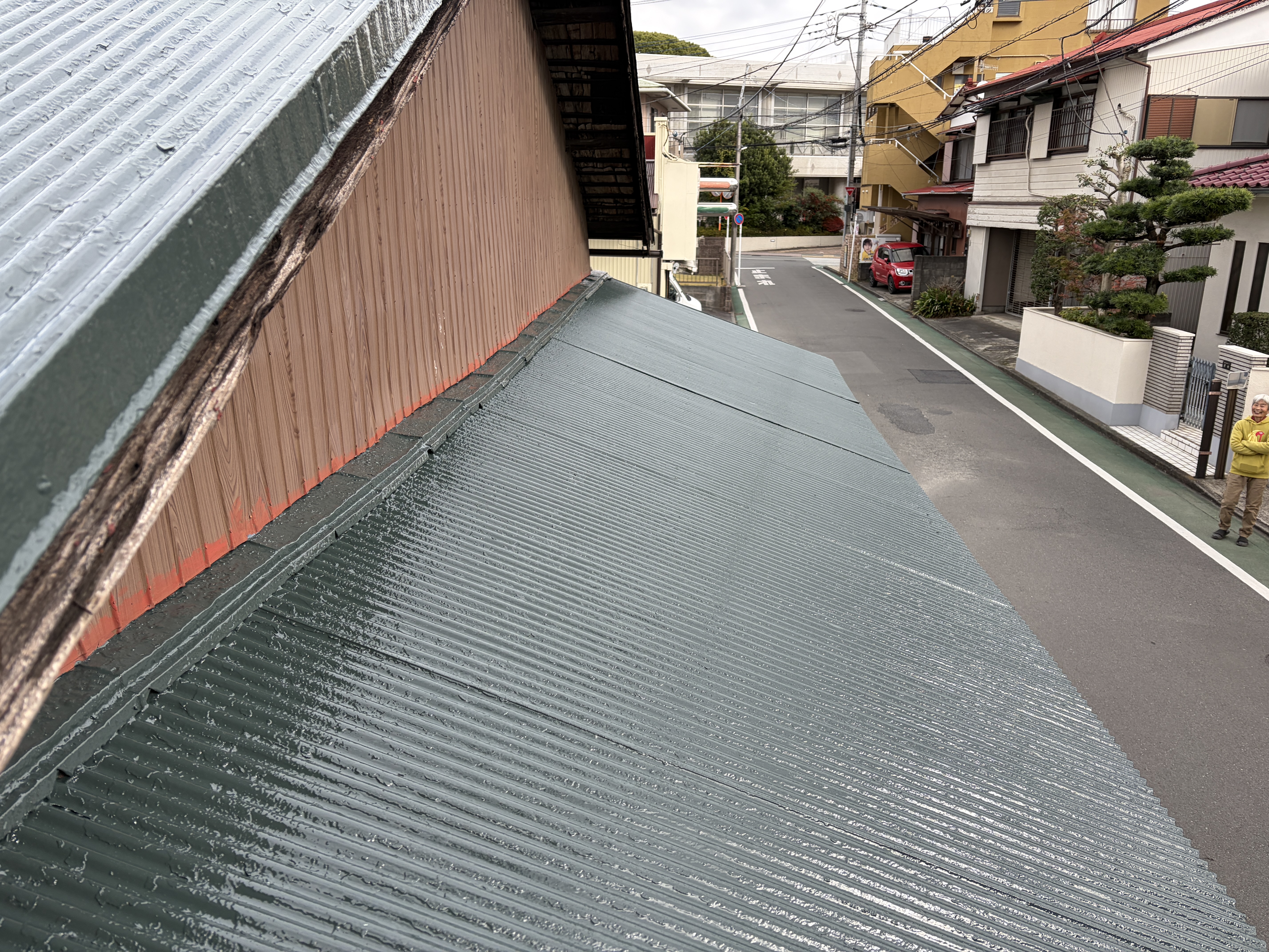 違う角度からもご覧ください!トタン屋根が、すっかりと、塗装職人の手塗りで元通りになりました!今回、ケレン作業がとても大変でしたが(一斗缶にケレンカスが2缶分以上!)下地調整を入念にさせていただきました。もちろんそれで追加料金を頂くということは御座いません。