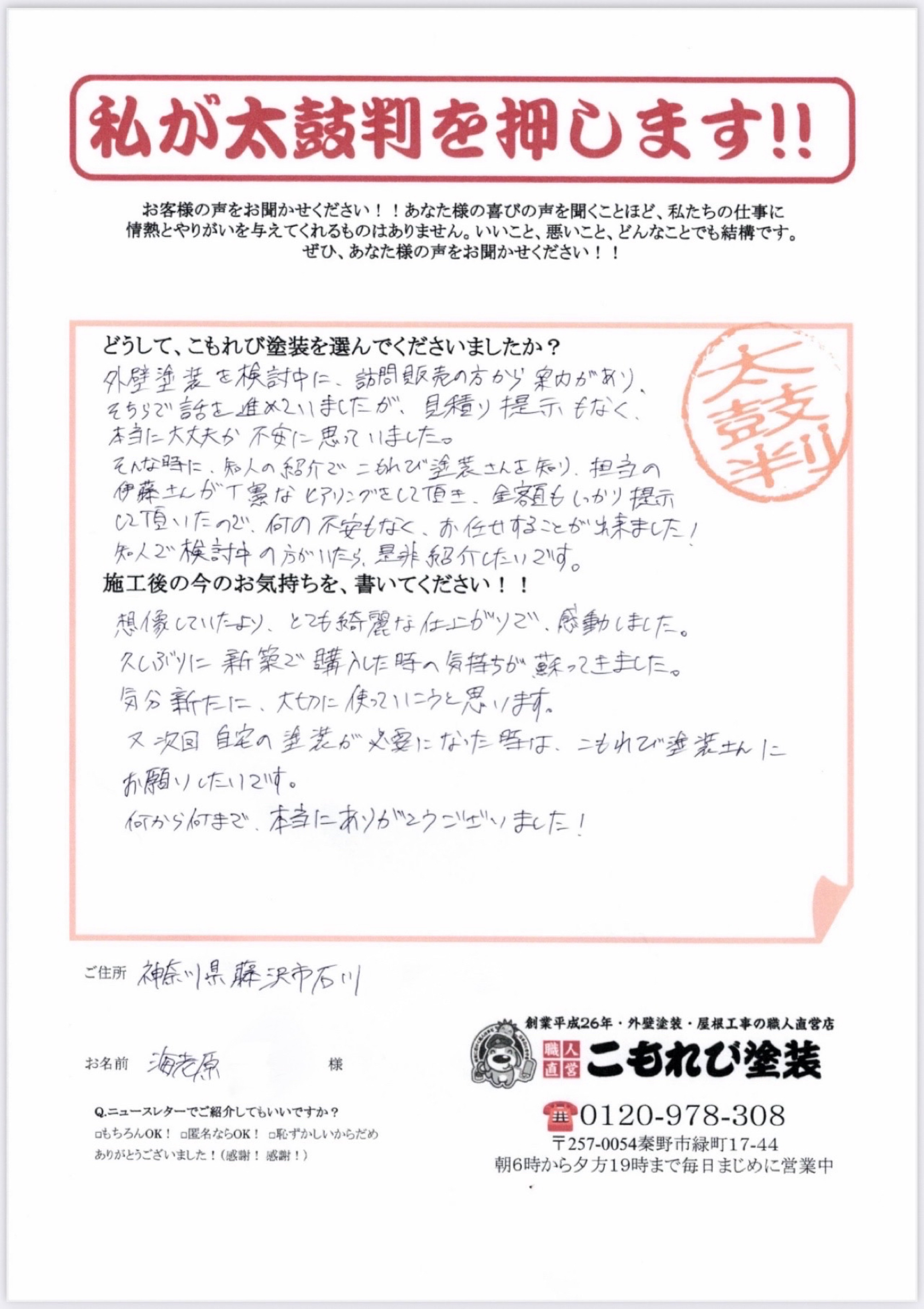 「海老原さん。今回は、当店ではじめての戸建ての塗り替えでしたが、ご信頼くださり、誠にありがとうございました。