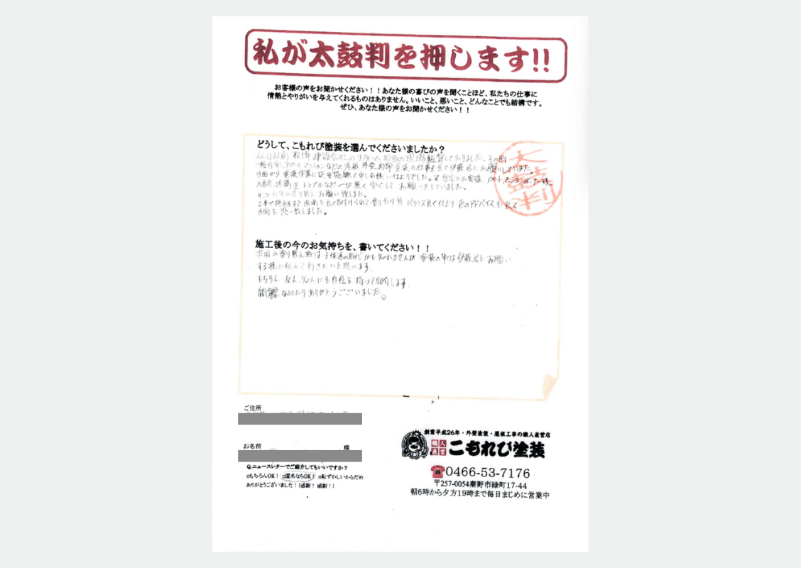 「匿名さんありがとうございました。自分にとっても最高の仕事をさせていただいたと心から思っております。日々のご配慮なども本当にありがとうございました。良い思い出となり、これから益々、塗装道に励んでまいります!」伊藤