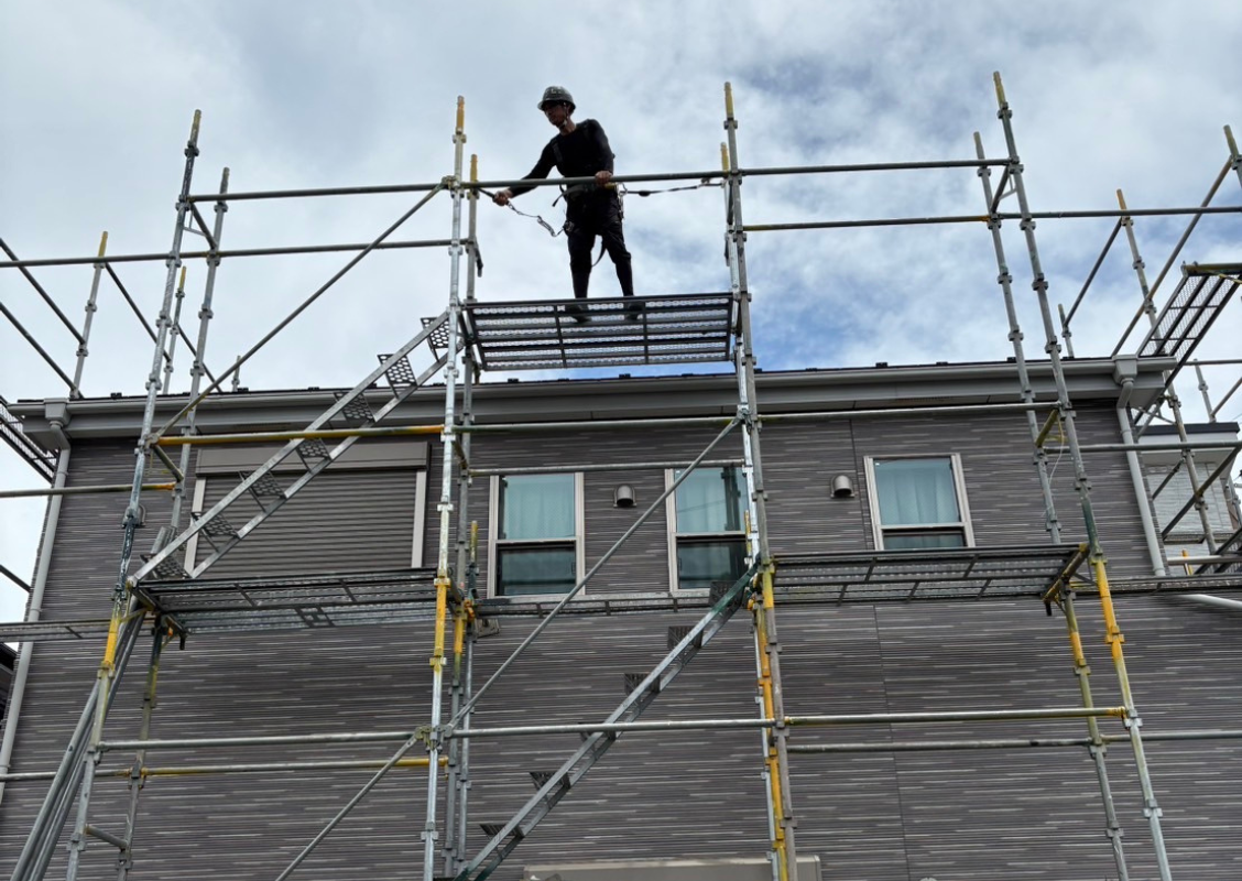 防水工事の場合は、必要に応じて足場架設を行います。場合によっては、足場を架設しない場合もあります。架設する際は大切な建物を傷つけないように慎重に組み上げていきます。